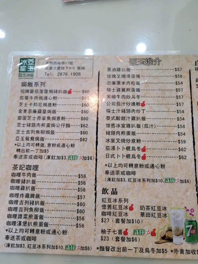 亞玉冰室相信住係元朗區既朋友無幾多個唔識,之前都食過好幾次,返食得就當然好食先會返轉頭,今日中午就再黎同朋友們食個午餐。餐廳門面同格局都同傳統既冰室有幾分似,同而家新派既冰室不同,但食物款式邊方面都比較有特色,例如焗野炒野之類都同一般茶餐廳款式不同,而味道都好夾。芝士豬頸肉煎蛋焗飯呢個我之前食過焗通粉,今日肚餓d食焗飯,先講個炒飯底夠乾身得黎唔會好硬,份量都好足,夾埋芝士汁絕配,豬頸肉大約有4-5塊,肉質爽口奕有調過味唔會淡茂茂,煎蛋就正常一隻熟蛋,成個餐好豐富。窩蛋芝士吞拿魚焗意粉朋友A揀既,意粉口感唔會過腍,吞拿魚同芝士汁都好足,窩蛋經過咁熱既焗汁轉頭都熟左7成了。亞玉鴛鴦焗飯朋友B揀既,鴛鴦即係雞排同豬排,茄汁同白汁,食到兩款排同兩隻汁,排炸過唔會好乾。凍檸茶少甜自己揀左少甜,茶味偏淡d,篤完檸檬酸味比較重。另外都介紹下亞玉既特色紅豆冰系列,跟餐加10蚊就有1杯大大杯,啤酒杯咁大,有溝埋咖啡或奶茶,之前就試過紅豆冰咖啡,個人認為就比較甜,同埋真係太大杯飲唔晒,有興趣既朋友不妨試試。整體黎講亞玉既食物幾有質素,款式都有特色,價錢黎講算中規中矩啦,無話太平又未到好貴,值得推薦。查看更多