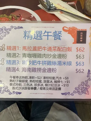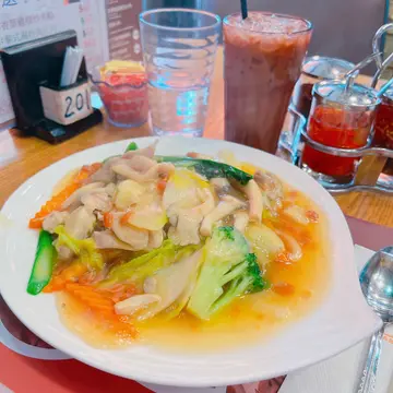 呢度如果多过四个人去开餐嘅地方因为有几张大枱👍🏻我哋今日崇拜完毕,有六个人lunch呢度呀扮靓妹话好抵食佢推介猪手拼海南鸡,加埋底盘D菜好似有四个菜一样,扺呀🤭🤭🤭而我今日就嗌咗檬粉因为平时都食开猪手拼海南鸡👍🏻正嘅今次嗌咗猪扒,猪扒虽然炸得都好似几劲不过都好味道,佢个檬粉仲有豆卜同埋萝卜,仲有啲生蒜,都唔错㗎而我想试好耐嘅泰式奶茶,卒子都试到不过比起我返乡下饮个杯泰式奶茶都系争啲🤭Anyway都系好饮嘅…查看更多