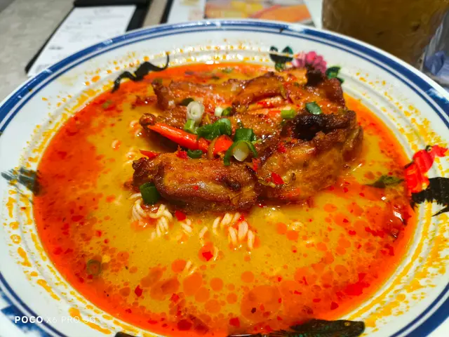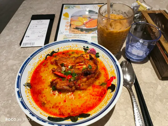 叫咗2個下午茶餐~喇沙豬頸肉湯河~有:蔥花粒、幾條生菜、6塊豬頸肉~喇沙好香椰奶味~好多辣椒碎~豬頸肉好淋~食落甜甜地煎得幾香口