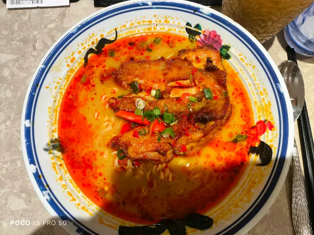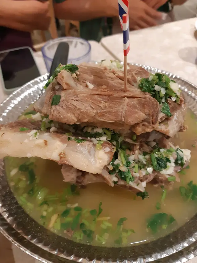 泰式豬扒湯河~有:蔥花粒、炸蒜粒、幾條炸豬皮、4塊炸豬扒切開上方便食~蔥花粒唔係好夾~中餐湯河先夾到~應該配泰式香葉、九層塔之類~湯味會更升華~豬扒冇骨唔會乾~香茅味嘢味