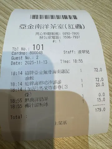 亚金南洋茶室,听个名就知食东南亚菜式,餐品选择非常多,每一道菜都充满了浓浓的东南亚风情,让人回味无穷,价钱亦相当亲民,跟同事两点钟到来食下午茶餐,升级特饮仲有半价,好味亦抵食。🌟 一字骨肉骨茶配汤米线绝对是必点之选。药膳汤底温润甘甜,没有过重的药材味,里面的料更是丰富,有一字骨、豆卜和鸡脚。一字骨早已炖得离骨软烂,入口即化,每一口都吸饱了汤汁的精华。🌟鱼丸鱼片头鸡丝汤河粉汤底散发着淡淡鲜香,河粉够滑溜,鱼丸鱼片弹牙爽口,有鱼味,鸡丝肉质不会柴,这碗汤粉都很鲜甜,不是味精之作。🌟鲜牛油咖央多士,咖央酱的椰香与厚厚的鲜牛油完美融合,邪恶又美味,绝对是甜品控的最爱。🌟沙爹鸡肉串烧(4串)鸡肉烧得微微焦香,仍然保持鲜嫩,灵魂在于秘制沙嗲酱,每人食咗两串,真系意犹未尽。鲜牛油咖央多士🌟黑白配(凉粉,红豆、豆腐花)滑嫩的豆腐花带著淡淡的红豆香,Q弹的黑色凉粉增添了口感,三者搭配,口感丰富,甜度清爽自然。🌟椰汁珍多冰椰香浓郁却清爽,甜度适中,加入翠绿的珍多,色彩斑斓,这杯饮品不只好喝,颜值都很高。🌟热美禄这杯热美禄充满南洋风情的热饮,味道比平常的巧克力更为浓厚香醇,童年的味道。…查看更多