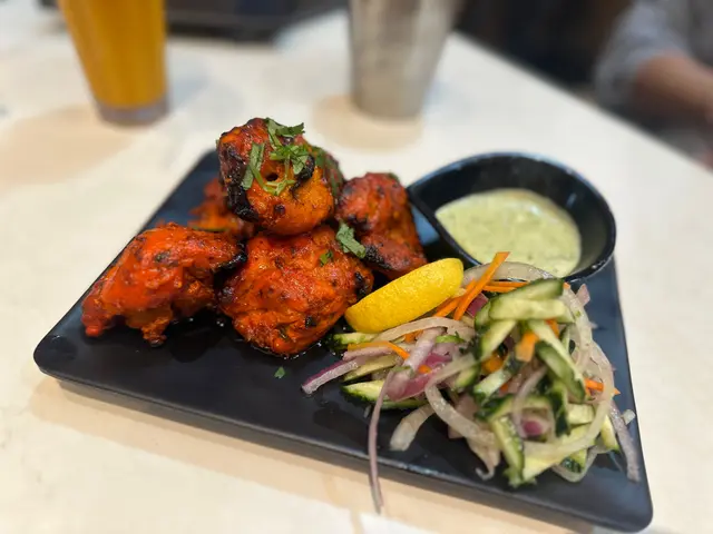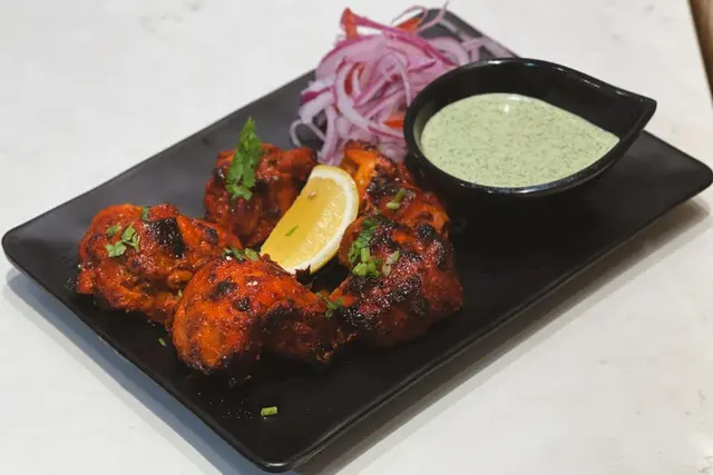 Chicken Tikka Chargrilled chicken marinated in red chili flakes and seasoned with authentic Indian spices (5 PCS)
