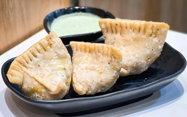 Vegetarian samosa (3PCS) Deep-fried fine filo pastry stuffed with potatoes, vegetables And Indian spices, served with tamarind and mint chutney