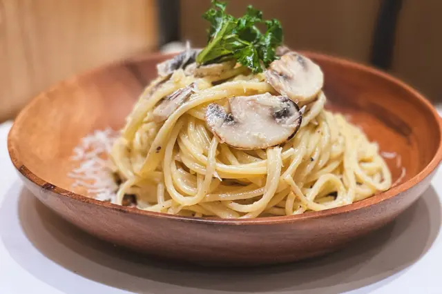 Chicken Alfredo Cream pasta with mixed mushrooms and shaved parmesan