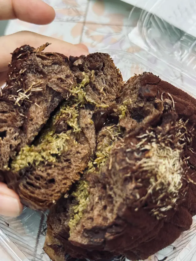 經過享樂烘焙 @ly_bakery 見到前排好hit既杜拜開心果朱古力新品喎 考慮左一秒 買左 ≖‿≖ ❙ 杜拜開心果朱古力可頌貝果 ❙ $35賣相奇特得黎充滿神秘感 原來係貝果加上唔少牛油製成既crogel氣孔比較大 彈性唔錯面頭裹上脆皮朱古力再灑上可可粉重點係內裡既牛奶朱古力夾住開心果醬 中間係好似蟲仔既小麥麵條 層次豐富呀開心果醬存在感係低 勝在唔甜(竟然!)成個包咬落脆口得黎有啲煙韌贏左口感同創意 一試無妨 ƪ(˘⌣˘)ʃ 查看更多