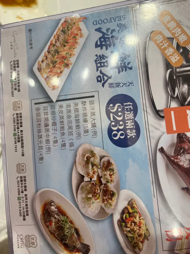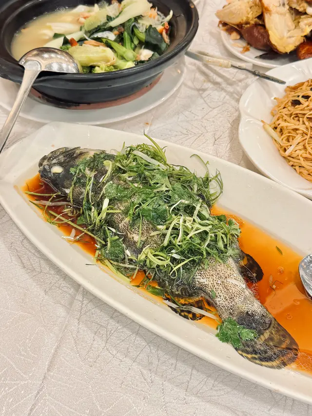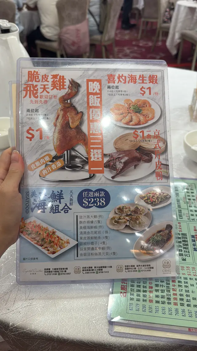 長輩家住大埔,晚餐提議去京都大酒樓,名字帶著幾分氣派,正好遇上他們的「晚飯優惠三選一」,一桌佳餚令人滿懷期待。 餐廳位於昌運中心,地方寬敞明亮,裝潢走典雅中式風格,圓枱設計方便多人聚餐。晚市時段人聲鼎沸,服務員穿梭自如,感覺熱鬧而不雜亂。