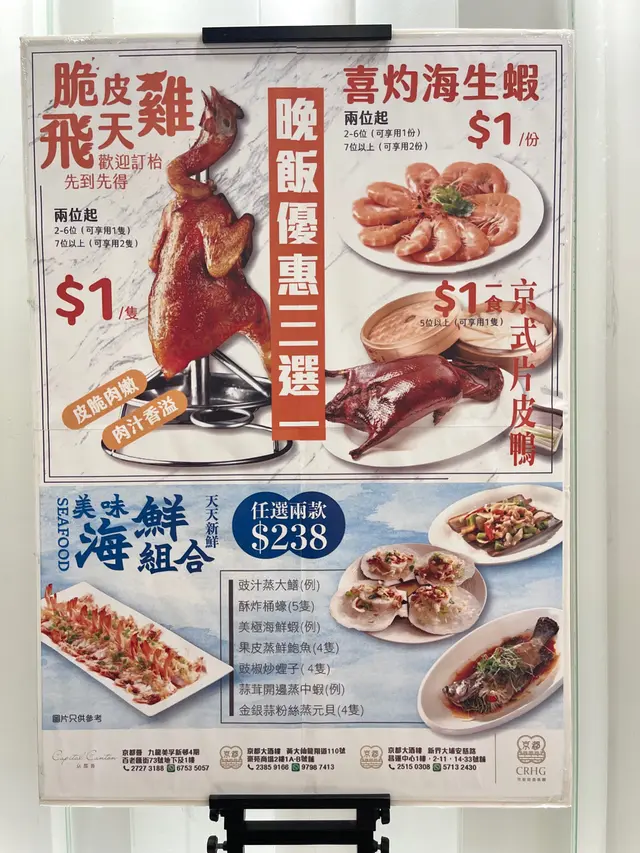 得知屋企附近「京都大酒樓」推出了一蚊菜式做招來, 趁住颱風假就同丫媽去酒樓食個晚飯。酒樓環境開揚, 座位唔算好迫。酒樓除了推出「一蚊」自選菜式, 仲有海鮮套餐同埋各款小炒。【脆皮飛天雞】HK$1原本對一蚊貨式不抱期望, 估唔到竟然係全晚最驚喜嘅一個菜式! 原燒隻雞棟篤企已經非常吸晴, 酒樓提供手套自行撕出肉食。燒雞燒至金黃帶點油光, 雞皮酥脆, 撕開雞肉, 豐富肉汁、黃油𣊬間傾瀉, 絕對可以用肉嫩多汁去形容! 雖然細隻, 不過都幾厚肉, 兩個人share食, 定必滿足。【上湯西澳龍蝦伊面】HK$328原隻開邊龍蝦盡顯份量, 上湯茨汁鮮甜美味, 伊面份量多, 盡吸湯汁精華, 不過龍蝦肉質偏林, 唔係爽彈果種口感。【豉油王煎焗海生蝦】HK$108(例)海蝦表面平均有鹹甜豉油汁醬包住, 部份蝦肉質爽彈, 配上汁醬一齊食, 鹹甜惹味。酒樓仲有好幾款中式甜品供選擇, 味道唔錯, 唔會太甜。【桂花糕】HK$28味道清甜, 散發淡淡桂花清新香氣。【椰汁紅豆糕】HK$28椰汁味突出, 夾集嘅紅豆口感綿密。…查看更多