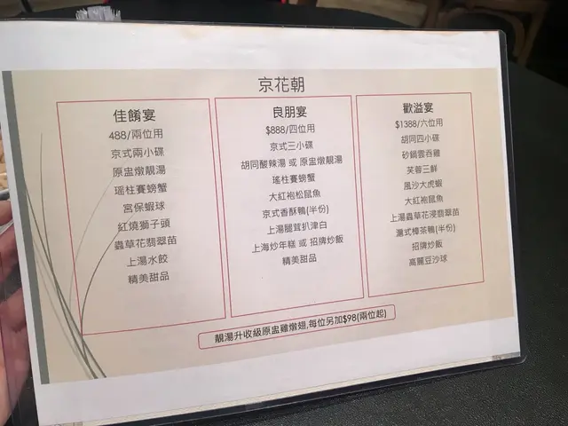 在銅鑼灣這個高消費地區,可以以$68的價錢,品嚐一個傳統京菜套餐,真是10分超值。套餐包括冷盤前菜丶湯、主菜及一個飯面。$68。有四碟,屋村餐廳都唔得啦。我同朋友兩個人食總共就有八碟前菜我哋叫了水晶淆肉、城山素腐方,湯就叫了花朝原盅燉湯及胡同酸辣湯各一,主菜京蔥爆牛肉、乾煸四季豆,另外再叫了北京炸醬麵。某一些菜式要另外加錢例如炸醬麵要加$10 ,但是整體來說,價錢已經10分實惠了,我覺得即使要加錢也是非常合理。…查看更多