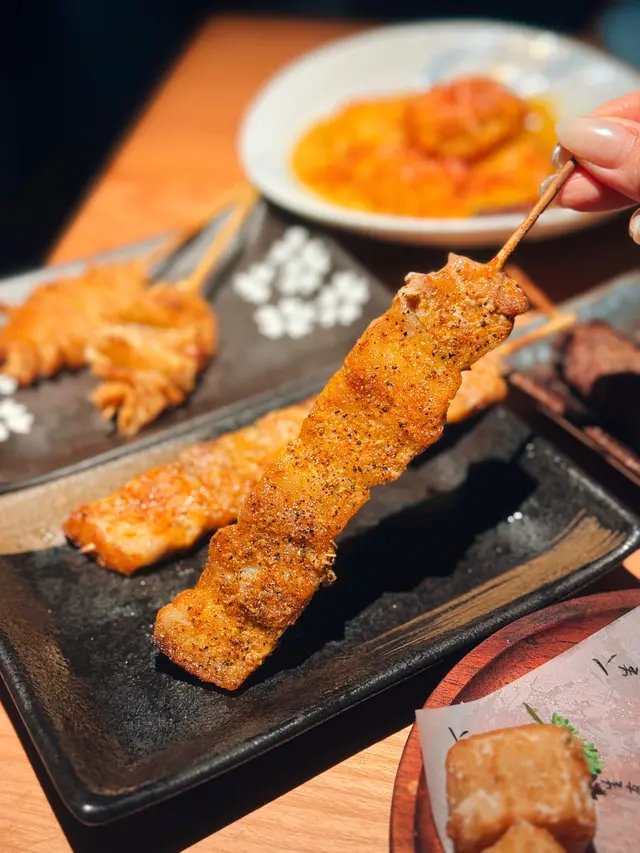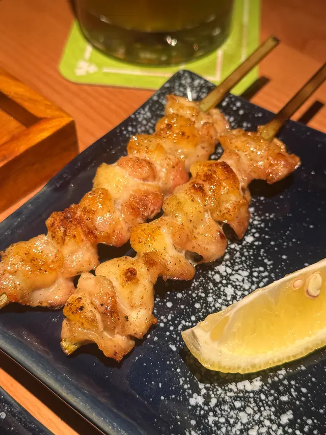 鹽燒豬肋肉 $28切到薄身方便入口, 外皮略焦啲位香脆, 入面油潤唔乾~~鹽燒鮮雞頸肉 $28咬落香滑中帶彈性, 好有「筋肉感」