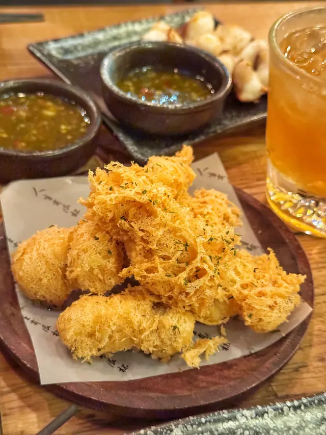 泰式燒墨魚鬚墨魚鬚的燒烤香味濃郁,搭配調味醬,十分開胃。