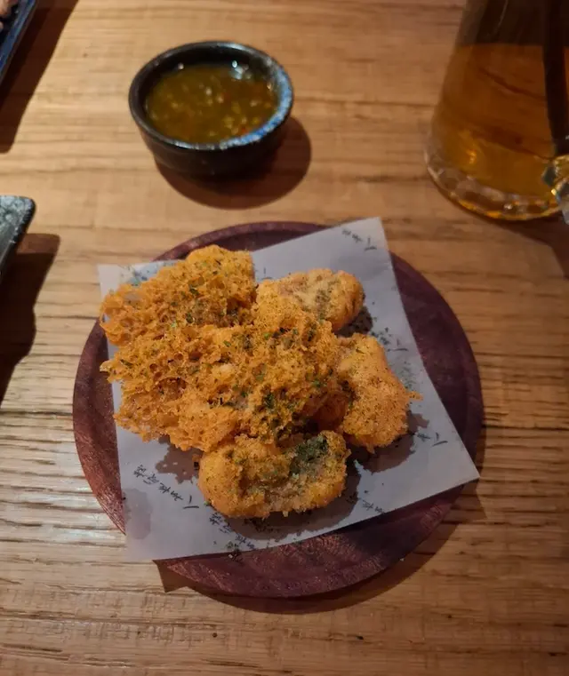 好友想食串燒,係銅鑼灣揾到一間隱世嘅串燒店 - 人生有限杯,依度有高質手工串燒,那就可以一邊食一邊傾下偈,慢慢享受快樂時光啦~餐廳裝修帶日式風格,環境舒適,地方寬闊,開放式廚房設計,坐係吧枱位置可以近距離見到師傅燒烤,每串都係即叫即燒。睇睇餐單先,推出咗多款嶄新又獨特嘅串燒,而且價錢亦都好親民。九肚魚(椒鹽/紫菜/泰式辣醬) $68炸至金黃酥脆嘅九肚魚,魚肉鮮嫩,用上椒鹽調味,風味十足。焦糖菠蘿鵝肝醬多士 $58麵包烘至香脆,外脆內軟,鵝肝醬口感creamy,濃郁味散發出來,香甜脆脆嘅焦糖菠蘿,3樣食材好夾,呢款特色又美味。港式蜜糖多士夾雪糕 $48香甜嘅蜜糖炸多士,夾住雲呢拿雪糕,一冷一熱,有創意嘅美味港式甜點。鹽燒雞腿肉 $20 雞腿肉散發燒烤香氣,帶少少鹹味,肉質新鮮,超香惹味。蒜蓉燒蠔 (2隻) $58 蠔都幾大隻,入口爽嫩,好新鮮唔會有腥味,加埋蒜蓉調味,非常惹味。明太子忌廉烏冬 $58忌廉好幼滑,烏冬夠煙韌,與蛋黃拌勻食,口感濃厚。豚肉牛油果卷 $28 豚肉燒烤完逼出油脂,食落香口,包住牛油果,牛油果入口即溶,同豚肉嘅油脂一齊食,口感非常豐富。鹽燒雞中翼 $20 雞翼燒得一樣咁香脆,調味均勻好入味,鹹味恰到好處,食起來好惹味。豚肉荔枝卷 $15 香脆嘅豚肉,肉質軟嫩,油脂豐富,包住荔枝,口感非常清新,減輕油膩感。冷泡白桃味烏龍茶 $18 入口清爽,帶點白桃香氣,食左多款串燒飲杯冷泡白桃烏龍茶,茶味甘香。…查看更多