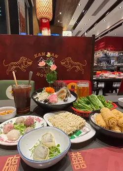 火锅配料牛魔王拼盘重量级食材,可以一次过品尝四个不同部位,包括有腩心、吊龙伴、牛颈脊、五花趾,一次过品尝滑嫩至充满油脂嘅靓牛!另外,仲点咗五宝丸、自家制韭菜饺、脆炸响铃和油麦菜。五宝丸都系新鲜手打出嚟,包括虾丸、墨丸、陈皮牛丸肉、猪肉丸、鲮鱼丸;自家制韭菜饺非常出色,皮薄馅又多汁;脆炸响铃系必点,新鲜炸起嘅响铃外皮酥脆,入口即化,系火锅之中只需要浸3秒,就吸收咗汤底精华,味道更升华!