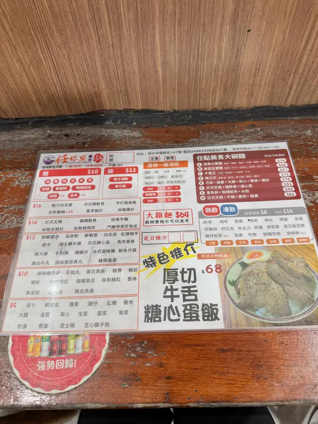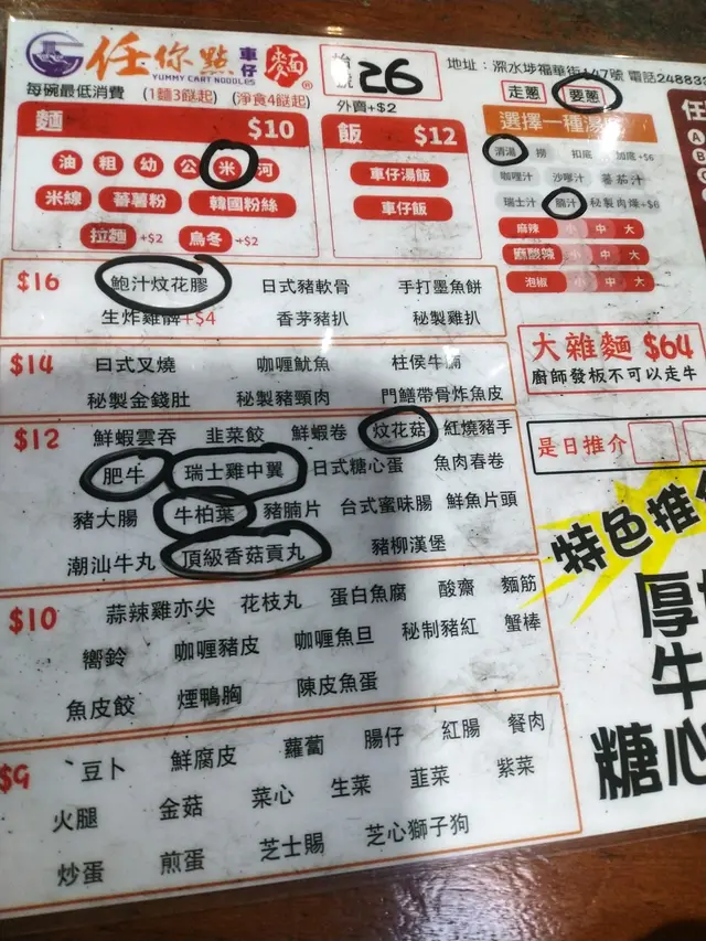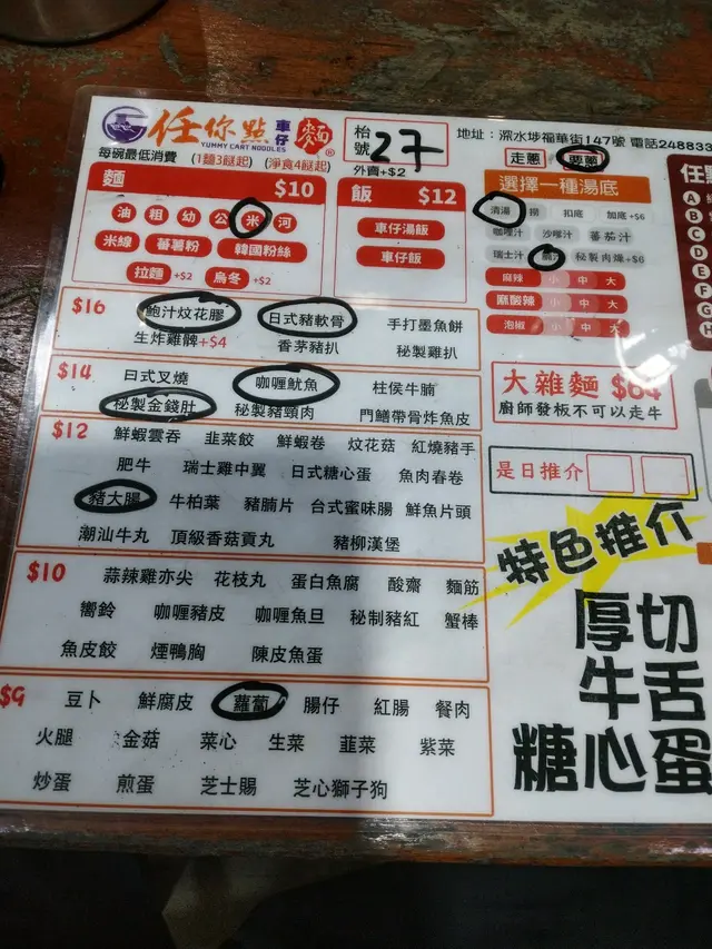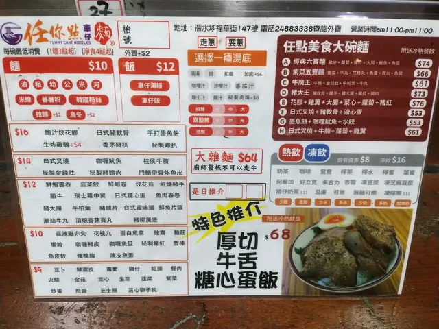 任你點車仔麵 (深水埗) 网址: https://s.openrice.com/QrLS00MS800 地址: 香港深水埗福華街147號地舖 电话: +852 24883338