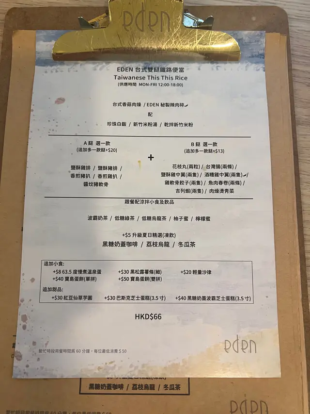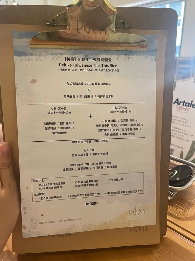 Intro: 觀塘工業大廈真多野食,而且有幾間台灣菜作選擇,而呢次就揀左eden作晚餐;而佢地店內裝修得唔錯,空間感十足;晚餐有套餐仲送台式飲品,就係賞茶品牌系列,加多$15就可以飲到更特別嘅飲品~ ___________________🍽 特盛 EDEN 台式雙餸套餐(台式香菇肉燥飯+ 鹽酥雞排/鹽酥雞中翼(兩隻)+ 涼拌小食+ 紅豆仙草芋圓 + 波霸奶茶💰91 ⭐ 5/10✍🏻 雖然套餐好似包括左好多食物,但主食嘅賣相就令人覺得好少,雞扒細塊得4片,好似炸得好乾咁,而肉燥飯好似一pat乾乾地嘅醬咁,盤內仲有空間;✍🏻 鹽酥雞排同雞翼外皮幾乾,好似炸完放置左好耐咁,味道就正常,但同想像中有啲出入,見到其他人嘅香煎雞扒大塊好多;✍🏻 套餐內紅豆仙草芋圓算係小甜品,芋圓又多又煙韌,花奶份量岩岩好,加埋紅豆仙草嘅配搭好好。✍🏻 波霸奶茶姐係珍珠奶茶,珍珠嘅size唔太大,整體都正體。🍽 肉鬆寶島蛋餅 配 輕量沙律 + 芋頭牛奶💰 67+15 = 83 ⭐️7/10✍🏻 蛋餅皮太乾比較實,內餡都唔算豐富,整體嘅鹹香味都唔錯;✍🏻 沙律菜多又幾新鮮,而呢個餐都幾岩輕食,份量相對上少。✍🏻 芋頭牛奶嘅奶味重,飲飲下有粒粒芋頭蓉,正常甜度係甜左少少。___________________🏠 伊甸 eden📍 觀塘官塘道436-446號官塘工業中心第四期1樓C室⭐️ 6/10___________________…查看更多