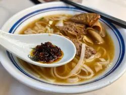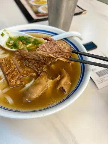 有邻居喺附近做嘢,话经常嚟呢一间食,都话好好食。咁今日咁啱过嚟尖沙咀,又见五点几都仲有下午茶咁就入去试吓。嗌咗个牛腩拼牛肠河粉,饮咗一啖汤,味道偏淡。再食一嚿牛腩,肉质偏瘦有少少似煲汤嘅瘦肉。真系好耐冇食𠮶啲牛腩系咁嚡同埋渣。牛肠就唔系好多膏𠮶边,所以都系偏干身。碗河粉都几滑,份量还可以。反而最好食竟然系个辣椒油,食落去有咸香味,跟住认真睇见到有虾米干,个辣椒油系有心思嘅。另外柠檬茶个茶底都偏淡冇乜茶味。