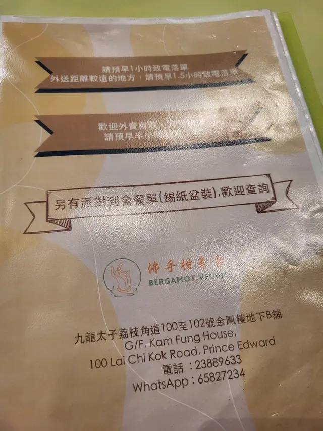 佛手柑素食 (太子) 网址: https://s.openrice.com/QrLS0epGA00 地址: 香港太子荔枝角道100號金鳳樓地舖 电话: +852 23889633