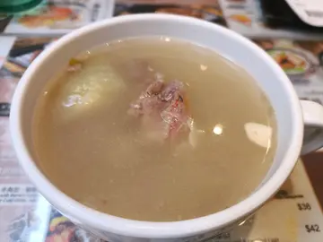有个女侍应攞咗两碗汤嚟, 我哋话冇叫汤,佢话请我哋饮