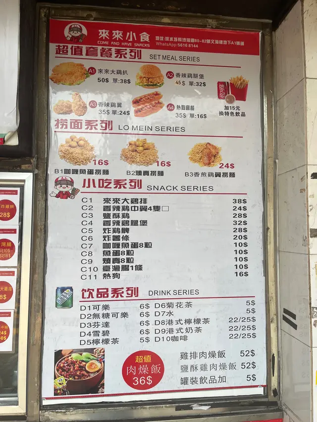 來來小食 (深水埗) 网址: https://s.openrice.com/QrLS0Tzg600 地址: 香港深水埗長沙灣道80-82號文海樓地下A1號舖 电话: +852 56168144