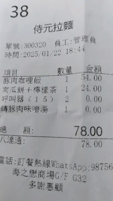 晚饭时间,都有位剩,唔驶等。叫完嘢食,坐低等呼叫器响闹取餐。等唔系好耐就有得食。本来散叫嘅,但喺收银介绍餐抵啲。有饭有汤同炸物。餐饮我唔要柠檬茶,因为觉得唔系好夹日式食物,所以改咗要豚肉味噌汤。汤唔太咸,有好多菜干同新鲜菜,足料,味到唔错。豚肉咖哩饭🍛,啲咖哩系食开日本嘅咖哩味,好钟意食