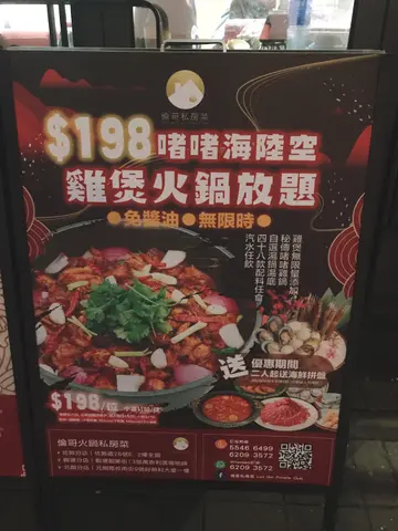 嚟到冬天梗系要打边炉啦,今次去咗观塘呢间伦哥火锅私房菜!佢有两个价钱嘅选择,今次我地拣咗288蚊任食打边炉,首先会俾咗两个前菜我地,开咗胃先。另外仲有鲍鱼同埋冬菇各一,冇谂到打边炉竟然会有鲍鱼食!炆得好入味,有咬口。首先最吸引嘅系竟然可以任食鸡!佢会以鸡煲嘅形式,再转打边炉,当然唔可以打完边炉再转返食鸡煲啦!店员会问你鸡煲要咩辣,鸡件好滑,酱汁好浓郁,而且亦都好香,岩晒重口味人士。另外佢出面都会有好多唔同配菜同埋饮品选择,丸类,菜,肠仔都有。之后我地叫左蕃茄汤底打边炉,汤底香甜,唔食辣嘅朋友都可以食到!另外仲有海鲜拼盘,蚝,贝类,鱼,蟹同带子。 自己都几推荐贝类因为好鲜甜,脆肉鲩都好爽脆。另外仲有牛颈脊肉,口感好好,必叫!另外我自己最爱就系墨鱼滑同虾滑,虾滑食到细细粒嘅虾肉,而墨鱼滑好浓味,配番茄汤底一流!我觉得呢间大胃王必选,因为真系食到好饱!…查看更多