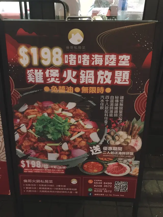 依幾天氣開始轉涼,令人好想去打邊爐上網見到倫哥最近有個新推介$198, 有雞煲同火鍋任食見佢咁抵, 即刻book位試下一開始先黎個雞煲雞煲可以自選辣度,我地揀咗小辣。兩分鐘炒一次,炒四次就會熟待應服務好好,同我地解釋係用生雞做仲主動過黎幫我地炒雞件嫩滑,配芫茜、紫洋蔥等等我幾鐘意佢o既花椒八角食落好香少少刺激但又唔會過辣除咗雞煲,仲有海鮮拼盤送比我地有大大隻蠔、鮑魚、青口等特別推介生蠔,鹹甜適中,肥美肉滑帶子味道鮮甜,海蝦緊實彈牙絕對值回票價打邊爐最緊要係碟牛牛味好濃,油脂好香烚一烚已經好嫰滑,真心正!雖然自助區唔係話好多種類但一般大路款式依度都有特別係丸類和菜類款式都唔少連響鈴、牛栢葉、水魷魚都有最驚喜係有鵪鶉蛋,值得一試查看更多