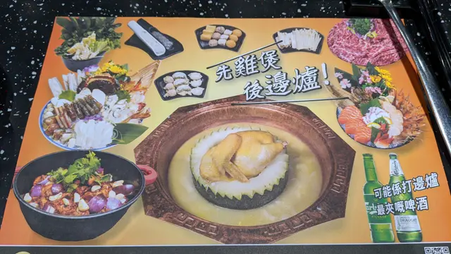 好耐冇食過雞煲而且近排天氣又轉涼見到倫哥有雞煲火鍋連任食火鍋有朋友試過話抵食一於就試吓啦$198 已經有齊雞煲邊爐海鮮依度係先食雞煲再打邊爐食完雞煲可以即刻加雞再食但轉左邊爐想再食雞煲就要加錢雞煲就揀咗BB辣職員都好細心每2分鐘就會行過嚟幫你炒一炒炒咗大概四次 雞煲就食得啦雞肉食落都幾滑身 醬汁落咗好多香料所以好香份量亦都好多食完雞煲就揀咗蕃茄湯底打邊爐雞煲會連住一個海鮮拼盤有鮑魚、青口、帶子、蝦、蜆肉、魚最好食嘅係帶子 好鮮甜旁邊仲有好多任食火鍋嘅材料同飲品值得一讚係芝心牛丸D芝士係流出嚟架食完仲會有一碗黑糖冰粉可以降下火都幾唔錯今餐食到好飽整體食物質素唔錯座位同環境都幾闊落侍應態度幾好又細心值得一試查看更多
