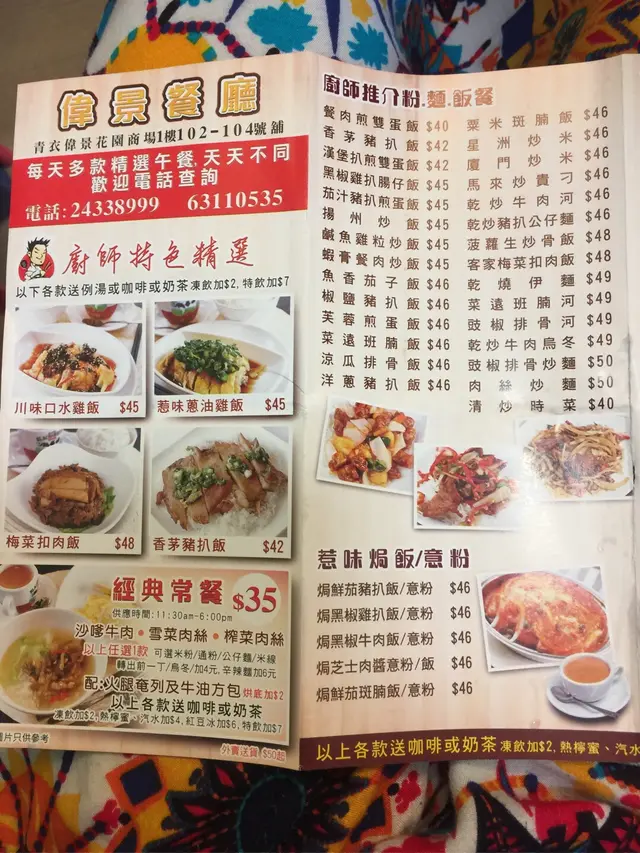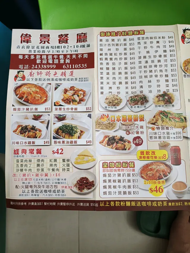 偉景餐廳 (青衣) 网址: https://s.openrice.com/QrLS0dEO800 地址: 香港青衣青綠街1號偉景花園購物中心1樓102-104號舖 电话: +852 24338999