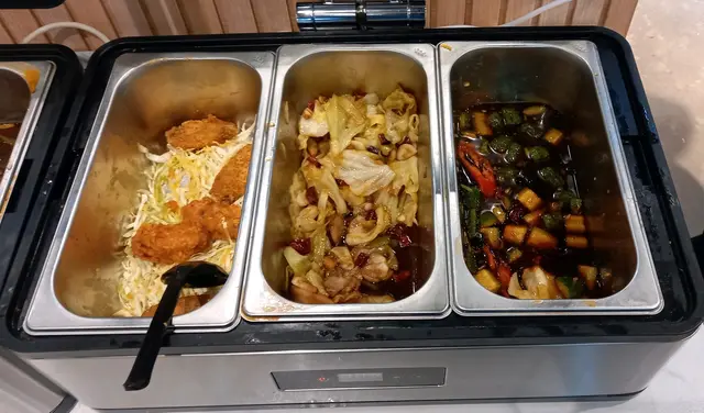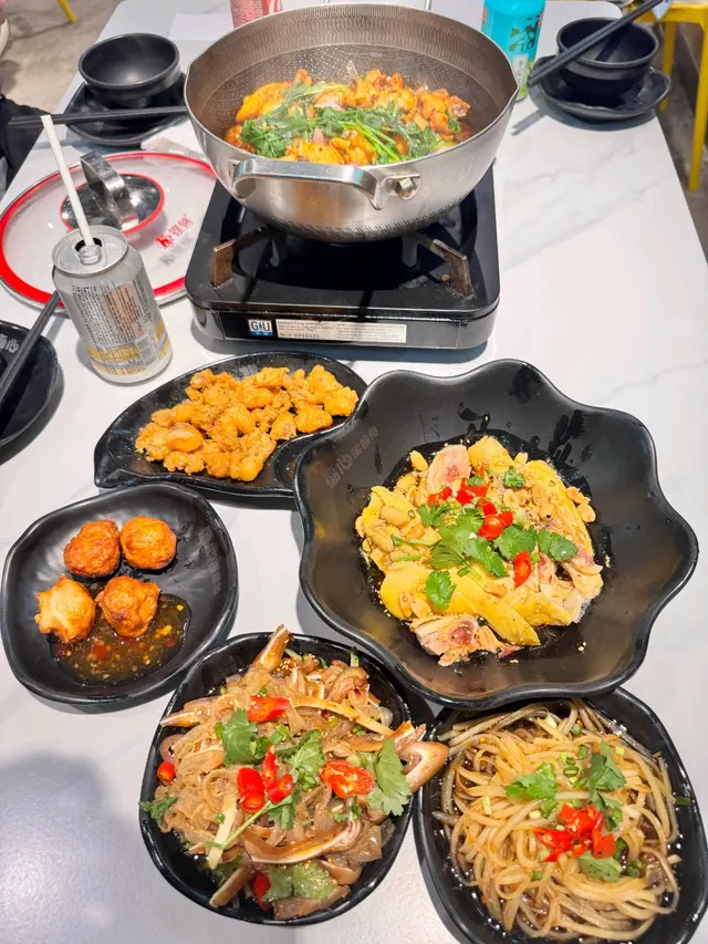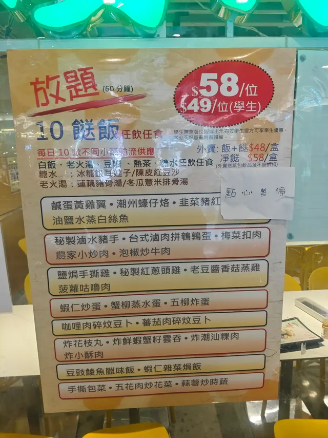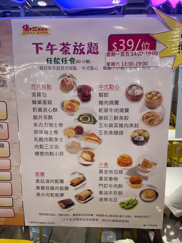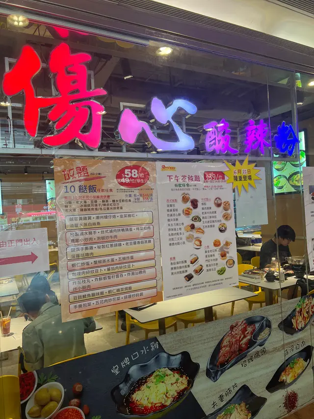 之前在社交平台上刷到伤心酸辣粉(越秀广场店)有39HKD的下午茶放题,苦于一直冇机会过来,于是前天放假专门来启德这边来试一试。结果发现39HKD的下午茶放题暂时取消了,于是就吃了58HKD的十餸饭放题,味道也很唔错,就是有的菜比较辣,但是添菜都很及时,糖水有电加热炉加热保温很好喝。韭菜猪红的韭菜有些生,咸蛋黄鸡翼非常好吃外酥里嫩,鱼的刺比较多所以我冇吃唔做评价,辣椒炒肉的猪肉口感唔错,自助豆浆也可以。…查看更多