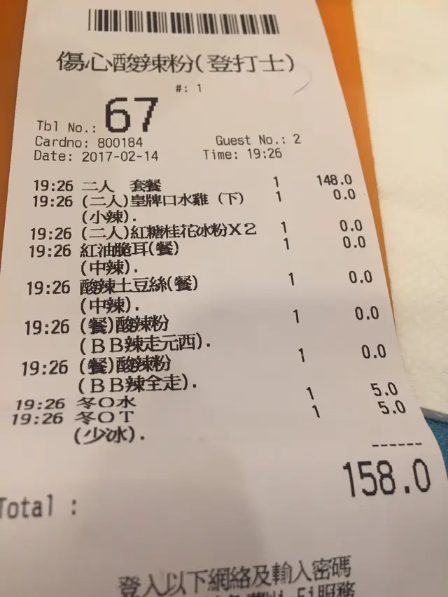 又想食辣嘢傷心酸辣粉係首選去過太子分店,但始終旺角分店更闊,坐得舒服啲二人餐好抵,可以一次食三送,但今次兩人都肚餓,加左個雞煲(半隻),夠飽!食辣嘢一定要飲凍嘢,呢個【柑桔話梅雪碧】,既有酸酸甜甜又有過癮凍冰冰雪碧【皇牌口水雞】真係皇牌,雞肉鮮嫩,雞皮爽口,醬汁入味,又有芝麻香,必點【夫妻肺片】牛什下面係青瓜絲打底,清香爽口中和油膩。牛什片片入味,薄切唔塞牙。【酸辣土豆絲】酸酸辣辣送飯No.1土豆絲夠幼,易夾易入口。酸爽好食!加左半隻【雞煲】,雞煲調味啱啱好,熱辣辣,有鍋氣,小小辣中帶甜,仲有洋蔥、青椒,齋食送飯都好呢餐酸辣加雞煲食得好滿足,辣得開心,會再幫襯查看更多