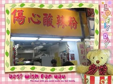 深水埗的伤心酸辣粉无论是地理位置还是地理环境(店内面积)都不能与旺角的那家楼上店相提并论空间实在是狭小的可以 不过好在门面还是非常清爽的 大大的霓虹灯箱不停闪烁 吸引著想要来此重口味之旅的食客伤心酸辣粉的价钱个人觉得还是很地道的有很多川味小菜 比如口水鸡 水煮鱼的套餐 配上一碗白饭再加一碟蔬菜什么的 绝对可以吃到很满足了另外还有2人套餐什么的 两个菜+两粉酸辣粉+两份饮料 之类的组合 非常合人胃口!考虑到粤广一带的人还是不太能吃辣的占多数店内提供的辣度从BB辣(太喜欢这个可爱的称呼了)到小辣中辣大辣都有 当然还有一种叫走辣 = =还记得第一次吃伤心酸辣粉的时候 印象并不是很好觉得桌子地上到处都是油腻腻的 虽然看上去擦得都挺干净。。。番薯粉并不是我所喜欢的那种QQ的 极有韧劲的口感相反却是糯糯的 软趴趴的 虽然很滑爽第一次叫的是中辣 (不太敢尝试大辣 但又不想吃不到辣= =) 辣味或是麻味木有吃出多少 倒是被一整碗的辣油呛得可以实在是太油了! 而且也没有酸味。。。单从才带上看跟《伤心酸辣粉》是有区别的!颜色上没有那么红彤彤的不过上桌后却让我大跌眼镜因为长得还是一模一样。。。有那么一瞬间怀疑店家是不是给我下错单了 o(╯□╰)o完完整整的一份金牌酸辣粉 还未动筷状态下可以看到非常丰富的“浇头"肉碎不是我所关心的关心的当然是花生啦~ 很多~~~ O(∩_∩)O花生嚼起来还挺脆 应该是刚炸不久的 如果时间长了就会软掉 就不好吃了香菜芹菜有些少了。。。 虽然自己已经习惯了香港这边蔬菜甚少的规矩颜色上依然是那么红通通的 有点吓人 嗅觉上也可以闻到一股浓浓的辣味和丝丝酸味上面飘著一层红油 让我心理上有些小担心 会不会又吃的一肚子油。。。幸亏辽上几口后 红油基本都被我打散了 番薯粉煮的有些烂了 。。。或者说本来就是那样软趴趴的始终还是不太喜欢这样没有嚼劲的粉丝中辣辣度比较适合我 不是很辣却也让我解了馋!吃的时候喜欢先挑花生吃汤底酸度这次总算是有了!不错~ 配著适度的辣味 酸酸辣辣 很是过瘾~所以等到花生吃的七七八八了 本来就不多的汤水也被粉丝吸的七七八八了 差点没变成一碗凉拌粉丝 = =…查看更多