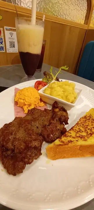 大热天时35度,带住小朋友活动完之后,身水身汗,见到附近有元朗冰室,一于入去医肚。餐厅嘅装修主要以黄色为主,感觉精神有活力。打开餐牌,有很多不同嘅选择,由一般茶餐厅嘅食品,到小朋友喜爱嘅菜式都有,正值下午茶时间,我哋一于试多几款一齐食。咖喱牛肉意粉牛肉嫩滑弹牙,意粉啖啖挂上香浓嘅咖喱汁,咖喱汁唔算辣,大人小朋友都食到。招牌厚猪扒上枱发现块猪扒size大过我只手, 唔单止大,还要是厚厚的。入口香脆啖啖肉,满满嘅肉汁,香气四溢。素菜pizza配薯条是日pizza是素菜口味,上碟时小朋友见到已经心心眼😍,我哋一人一块,食落有惊喜。批底香脆,配上三色椒及菠萝,香甜爽口,小朋友食唔够。和风鸡肉披萨 小朋友要encore 🍕, 试埋佢嘅和风鸡肉披萨。全个pizza有八件,鸡肉配上和风酱,加埋脆脆嘅饼底,一人一件好快又食晒。冰室一口西多士一口西多士外脆内软,配瀑布炼奶及朱古力酱喺面,切好晒一粒粒size刚刚好,小朋友食到舔舔脷,如果多啲朱古力酱仲正。禾味烧BB鸽外观色泽光亮,散发着脆皮香气,入口皮薄肉嫩,配上淮盐,提升乳鸽口感层次。沙嗲牛肉包嫩滑弹牙嘅牛肉,配上香浓嘅沙嗲酱,再放入刚焗好香脆嘅热狗包内,入口沙嗲酱满满的近乎爆出嚟,夹埋热狗包吃刚刚好,口感大满足。咸鱼鸡粒炒饭炒饭够干身,粒粒分明,配上爆香咗嘅咸鱼粒及鸡粒,每一啖都有唔同嘅口感,层次分明,一人一碗好快又K.O. 哂照烧汁鳗鱼丼小朋友想食鳗鱼,煎香嘅鳗鱼面上铺上厚厚嘅鳗鱼汁,香滑绵绵,配上海带、粟米及配菜,大家表示食完饱饱。总括而言,价钱大众化,性价比高;夏天热热,坐得舒适。小朋友最钟意食佢个比蕯,绝对系厚切猪扒以外嘅另一小惊喜。…查看更多