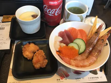 炸鸡配杂锦鱼生丼,除此之外还有一个茶碗蒸旦,碰巧这天有没有面豉汤,因此可以以罐装汽水代替,那就更合我心水了。