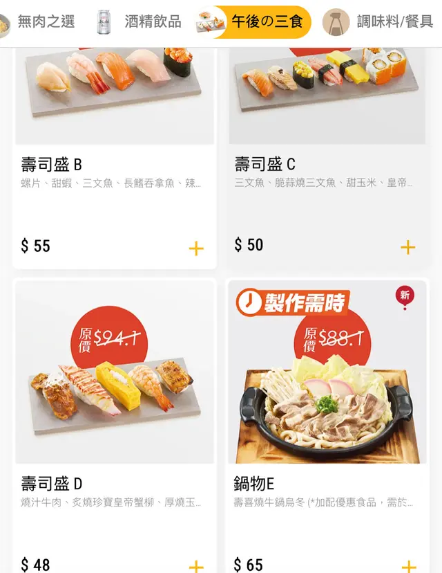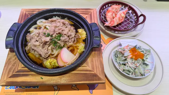 過了午市高峰時間,去了元氣壽司吃午後の三食午後の三食一共有6款,價錢低至$48,最貴都是$65。午後の三食嘢主要都是不同款式的壽司盛和一款鍋物今天我的點了最貴的午後の三食套餐。包了一個壽喜燒牛窩烏冬、一款自選茶餐輕食、一款自選茶餐小食。自選茶餐小食就點了「炙燒珍寶皇帝蟹柳」、而自選茶餐輕食就點了「蟹籽沙律」。雖然兩款小食和輕食份量不多,但以$65這個價錢,有3款食物,確實非常超值如果真的還未飽,還可以加錢加配手卷、刺身、甜品和熱食等等…查看更多