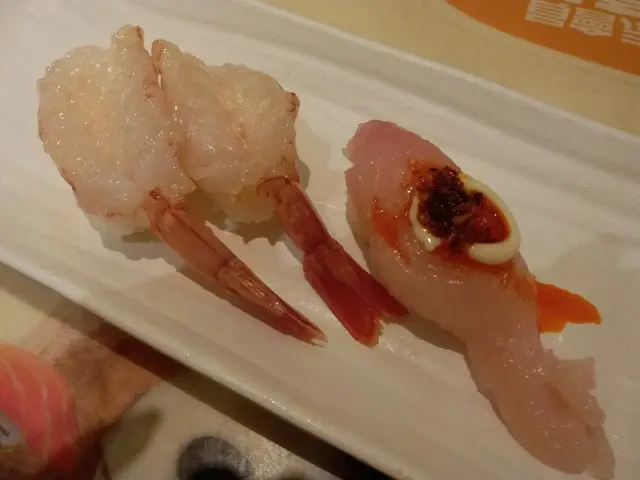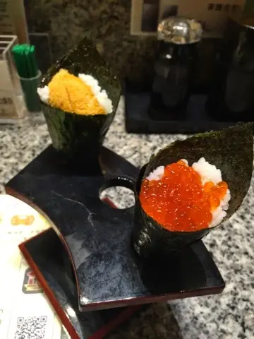 這兩款分別是 赤海蝦壽司和辛辣長鰭吞拿魚壽司赤海蝦肥口鮮甜