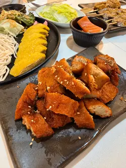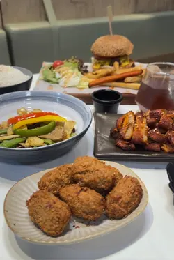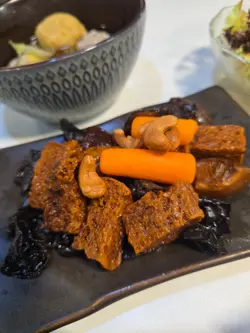 我friend介紹我試下葵涌人氣既素食餐廳「入素」,原來葵興地鐵站B出口一出就到KCC,經冷氣天橋行完全唔使行地面,唔驚日曬雨淋真係幾方便🥰下晝黎搵食,點咗幾款招牌同特色菜式,感覺好新鮮又飽到顛🍅關東煮+素三文魚+撈麵關東煮湯底唔會死甜,素獅子狗、素肉丸同埋魚卷等等爽彈有鮮味,三文魚刺身用蒟蒻整成,點埋芥末同豉油,口感軟熟有「鮮味」,入口真係幾可亂真,你話係齋我都唔信🤣再配上海拌麵配麻醬(仲有口水汁選擇),超滿足~🍅四喜烤麩依道就算普通上海菜館都未必好食,但「入素」整得好有驚喜,調味啱啱好,仲一啲都唔甜,入面有素烤麩、冬菇、胡蘿蔔等,烤麩食落軟硬適中,索晒汁好餸飯,最岩重口味既人🍅葡式乳豬飯上枱就見到金黃色甘黃飯,素「乳豬」口感真有驚喜,「皮」超脆!又唔油膩之餘,層次感又夠,完全唔覺係用腐皮整食🍅炸春卷入面包咗牛蒡、沙葛絲,好特別~細細件、炸到金黃脆口,唔油膩,好正🍅藥膳牛肉薑湯麵(配擔擔麵醬)熱辣辣一大碗,湯頭清香藥材味,色濃但唔會搶喉,令我諗起馬來西亞嘅肉骨茶或者台灣嘅十全大補湯,配菜有素肉、冬菇、娃娃菜等,啱晒秋冬飲暖胃❄️ 擔擔麵醬微辣惹味,拌麵一流🍅話梅涼瓜印象深刻!本身唔食苦瓜,最怕既苦澀味竟然消失晒;加埋清爽嘅話梅酸甜度適中,調味好精準,解膩refresh,夏天食簡直一流,令我對苦瓜印象全改觀😲🍅麻醬秋葵清爽秋葵加濃香芝麻醬,簡單又惹味🍅餐湯、飲品 🌽素餐湯暖笠笠又有甜味,冬菇配粟米自然鮮甜,齋湯都好有心思🌽熱茉香綠茶(無糖)超濃郁!茉莉花味好清香,食完炸物飲一啖,舒服又去油膩🌽百香果綠茶(涷)又係沖得好濃郁,果香十足,冰涼又爽口,夏天飲一流「入素」唔只做齋餐咁簡單,每款菜都好fusion又有新意,味道好而且層次豐富,份量有誠意,超飽!…查看更多