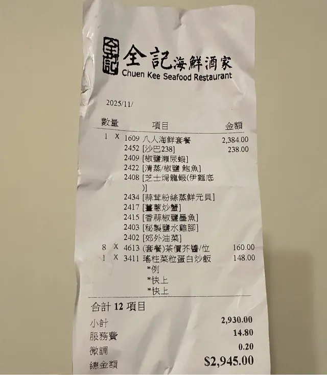 早两几日喺西贡食海鲜,在全记,其餐厅门口自家海鲜档拣海鲜都要收人头加工费。本来明买明卖无问题,但点晒菜先 讲,全记海鲜餐厅收费不透明 希望游客可以看到此信息, 一起捍卫香港美食之都A few days ago, I went to Sai Kung to eat seafood at Quan Ji. At the restaurant's entrance, they had their own seafood stall where you could pick your seafood.However, they charged a per-person processing fee. While it's fair to say that clear transactions are acceptable, the issue is that they only informed us about the charges after we had ordered everything. Quan Ji Seafood Restaurant has unclear pricing.I hope visitors see this information: Quan Ji Seafood Restaurant has unclear pricing. Let’s work together to protect Hong Kong as a Culinary Capital…查看更多