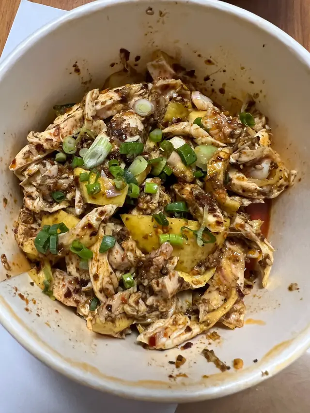这家是主打正宗的重庆凉皮!但并不正宗!不是米皮的凉皮!是口感很顺滑的港式凉皮!面皮很透!有点类似宽大版的东北拉皮 但口感更绵更顺滑!我特别喜欢这个口感😆嗦起来超爽!有路过就会买一碗尝尝加了很多脆豌豆以及青瓜丝,特别适合夏天来一碗!太子店断断续续也一直有人流,算是香港小有名气的凉皮店了~辣度的话我觉得在香港算偏辣的 所以点餐切记不要挑战大辣这家的小菜也做得不错~店家最推荐椒麻鸡!但我觉得口水鸡更好吃的一点,酱汁调的都很不错~