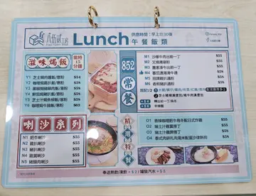 新蒲岗有各类餐厅,有平民化的,亦有高级的。经过一间玻璃门的餐厅,招牌富有创意和特色,又融合新蒲岗的工业特色。进入餐厅,看见墙上有一幅以狮子山为背景,中间是招牌852的工房,极有心思。看看餐牌,午餐由四十元至五十元不等。很久没有吃猪软骨,便点了温泉蛋猪软骨饭和餐饮-热柠水。特先送上热柠水,柠檬片很鲜黄,看得出是新鲜的柠檬。数分钟后,送来一大碗的温泉蛋猪软骨饭,有一只温泉蛋、五六件猪软骨和数片腌萝卜在饭上。水嫩嫩的温泉蛋与酱油饭拌匀后一口接一口吃著,不知不觉把整碗饭都吃掉。至于猪软骨方面,份量充足,且入味。唯一不足之处是肉煮久了硬身,肉多软骨少。蛋白质丰富的温泉蛋猪软骨饭配上几片的腌萝卜有助消化。进食期间,有数位客人与店员交谈,看来是熟客。因外面大风,故建议食客坐在餐厅较入位置。毎当食客付款和离开餐厅,店员都会说多谢和欢迎下次再来。