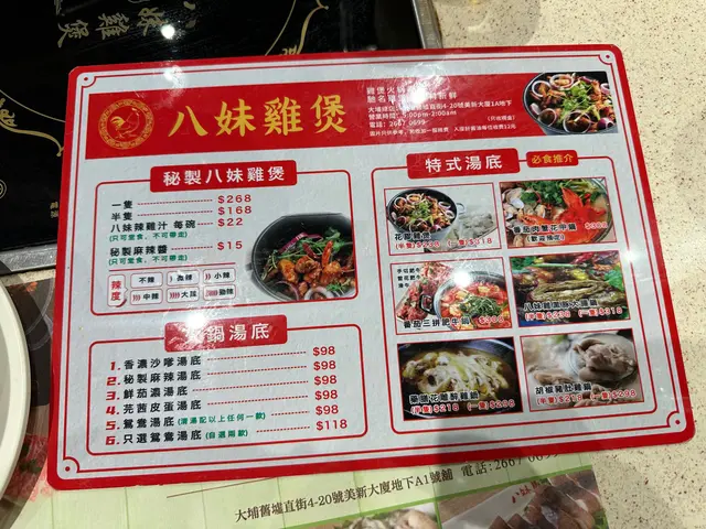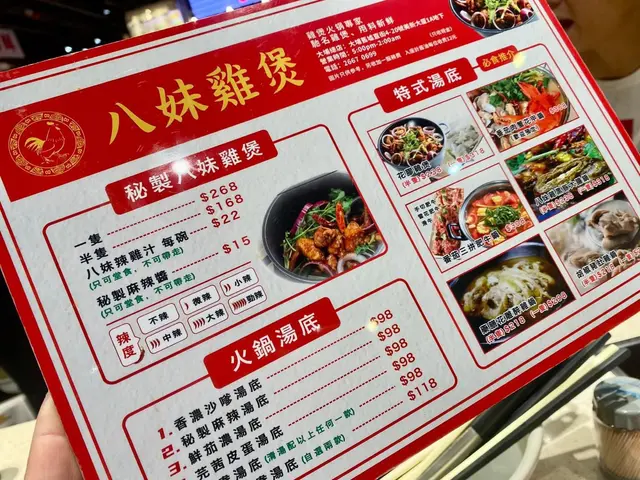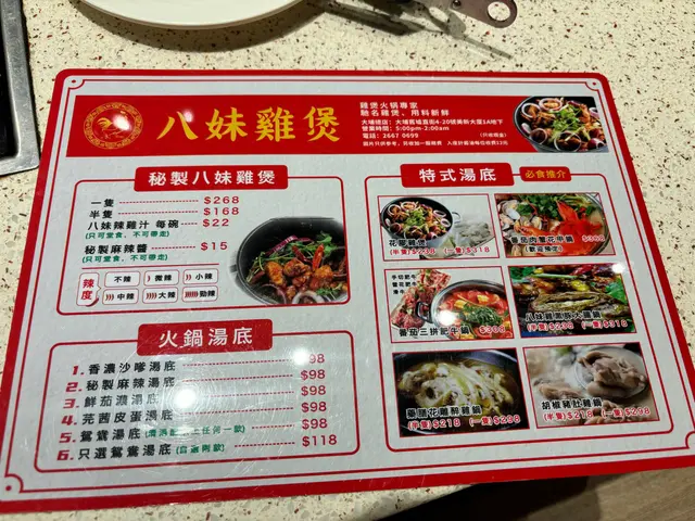 #秘制八妹鸡煲酱汁好浓好够味,小辣啱啱好唔会太辣。鸡肉都足料,食落去真系好惹味!最欣赏佢嘅汤唔系普通清水,每台都放咗一樽奶白色嘅汤,所以最后食完鸡再加汤打边炉嘅时候,汤都唔会淡!#椒盐墨鱼咀新鲜炸出嚟,个皮好脆,但调味少咗啲,要点埋鸡煲酱一齐食,味道就啱啱好。#手切肥牛油脂分布几好,食落去都有牛味!#墨鱼滑拼虾滑中间食到墨鱼肉同虾肉都足料,但略嫌唔够弹牙。#总结整体嚟讲味道够晒,而且食材都几有质素。虽然有啲小地方可以改善,但都值得试下!…查看更多