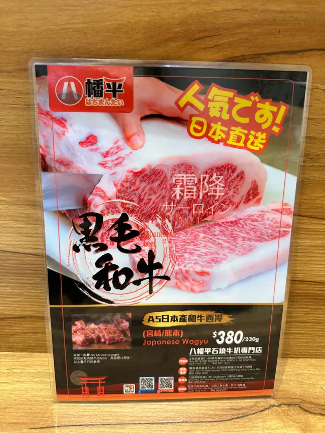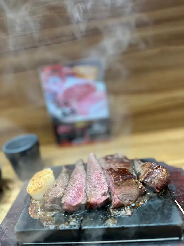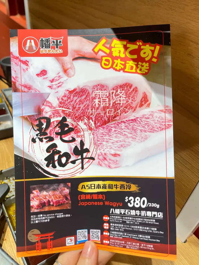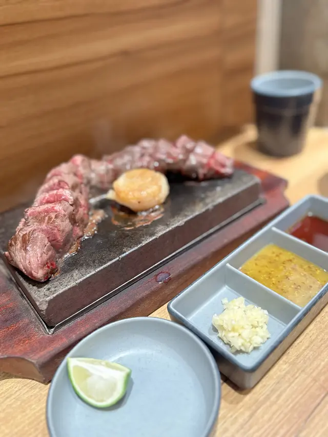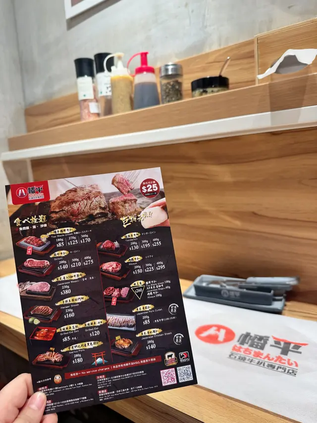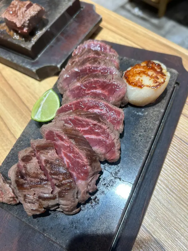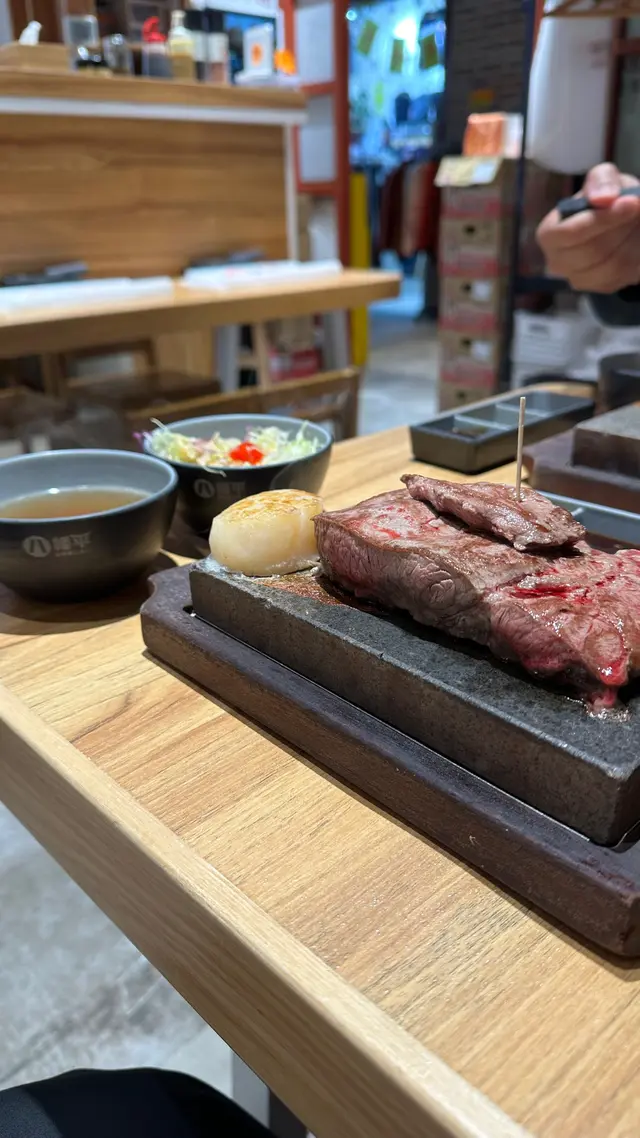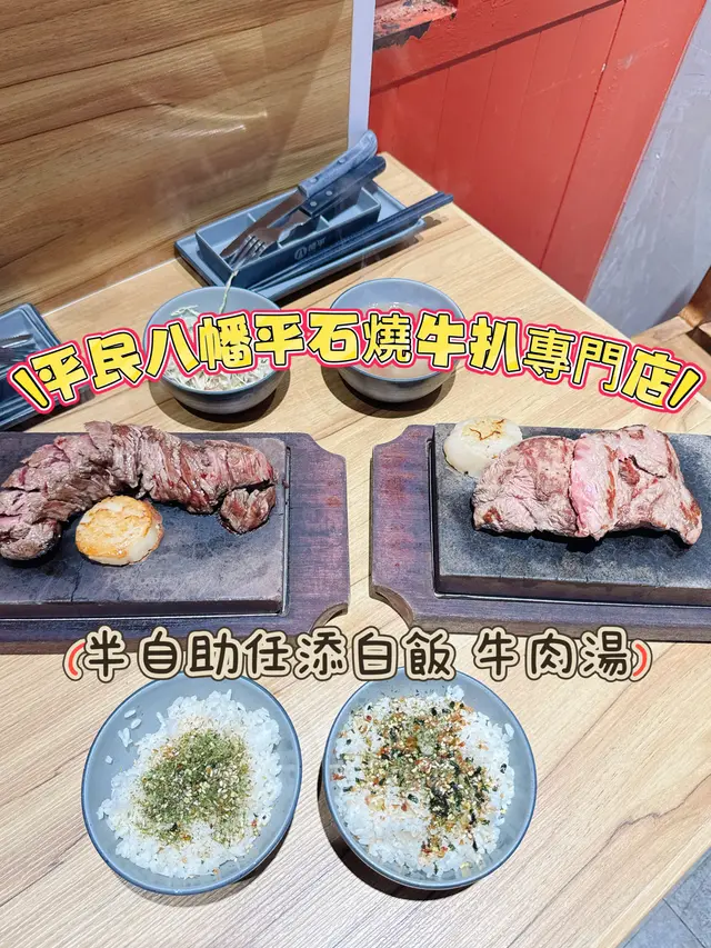 今日突然好想食石燒牛扒, 上OPENRICE 搵下附近有無啦. 搵到呢間"八幡平石燒牛扒專門店. 環境乾淨整潔唔會油淋淋. 好似日本小店精緻實用所有野都係. 門口有自助點餐機可直接點餐, 店員都會過來幫忙如有問題 , 座位上提供圍裙 非常好 ! 八幡平招牌牛扒 270G $125 招牌牛扒好大份. 我自己比較鍾意食medium rare, 所以一上枱我馬上切開一半. 一半放碟上先. 先食一半. 表面焦香鎖住肉汁. 非常可口軟淋. (如果石頭唔夠熱可以請店員協助更換一塊熱石)珍寶元貝 (扒餐+HK$25/一枚) 元貝好大隻,好厚肉, 鮮甜多汁, 記得唔好燒咁耐. 青檸封門柳 230G$160 肉質柔嫩,牛味濃郁 加埋青檸汁 多一重種清爽味道, 餐廳幫我切件, 方便食用。 加配左元貝, 好大粒啖啖肉, 煎到表面焦脆特別爽口, 值得加配。 自助吧提供的沙律, 蘿蔔牛肉湯和 珍珠米飯仲有飯素 ,全部都係無限任添。 特別一提個牛肉湯一定要飲,真係好足料用好多牛肉煲,入邊仲有洋蔥所以都好清甜。 單係個湯已經完勝好多石燒牛扒店。 八幡平石燒牛扒專門店 地址: 鰂魚涌英皇道1010-1056號東匯坊地庫077號舖太古站B出口…查看更多