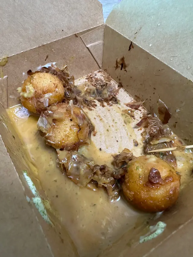 夜晚9點幾買,唔知係唔係做定好多,就咁唧醬出餐,一食落去只係微暖。醬好多,全靠個醬帶起成頭家,本身粒野無味。同埋有一半勁硬,食哂8粒牙都痛,好明顯做定好多,慶到硬晒⋯⋯歡迎測試牙齒健康。。同埋收銀阿姐串到撲街,無散銀/唔係比exact cash千祈唔好去買,開口埋口靚仔靚女,其實order d客跟指示,仲聽到同我前面果個講,下次唱定散紙先好嚟。相比起其他章魚燒,人地即整,有心機,呢度粗製濫做,做定一大堆,食過一次即刻知咩事,真係有比較有傷害查看更多