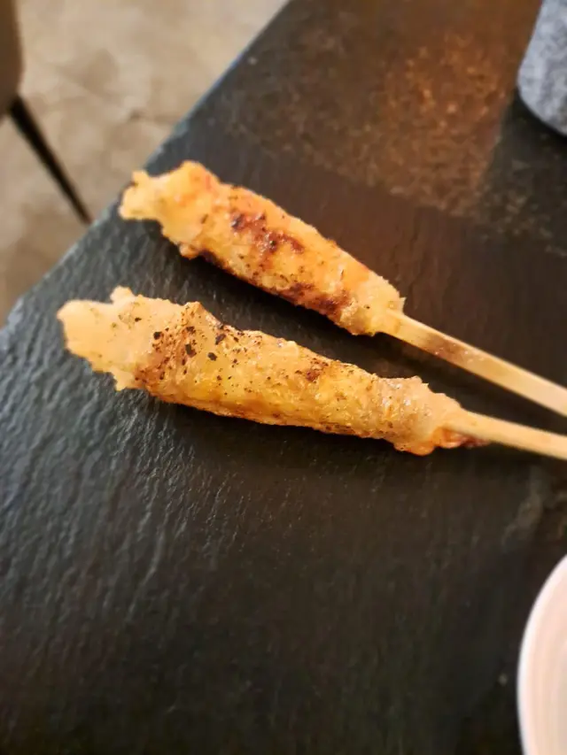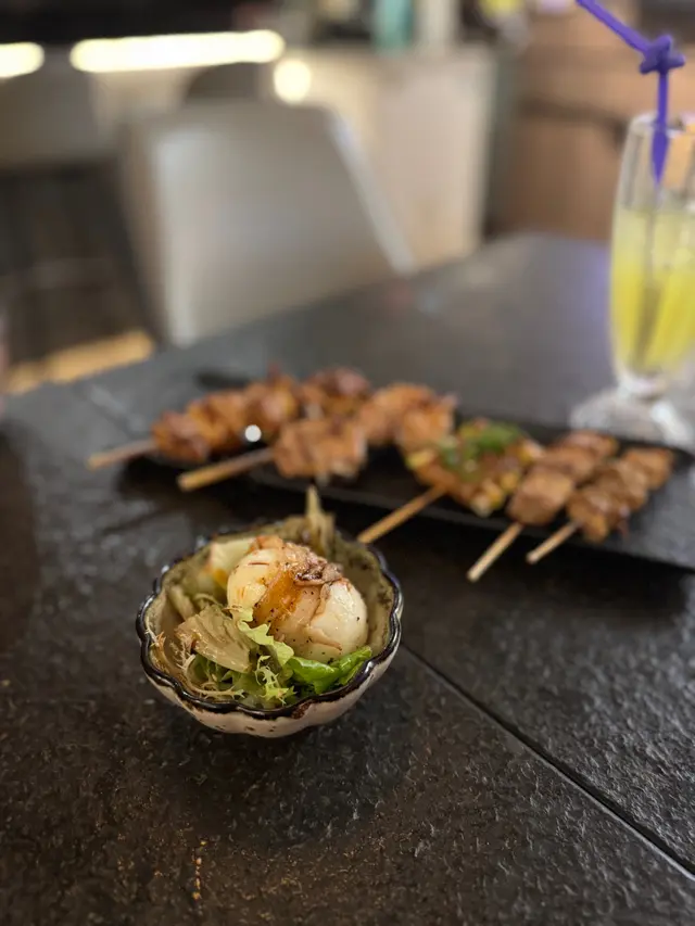 今晚同friend去咗尖沙咀呢間「其匠燒」食串燒,間舖頭唔算好大,但勝在夠晒格調,好有風味。裝修似足日本居酒屋,坐得幾舒服。啲侍應後生仔幾好禮貌,落單快,又會主動同我哋講解吓啲特色菜,服務抵讚!首先,個蟹籽沙律係一個好好嘅開始。青瓜絲同蟹柳絲都好新鮮爽脆,上面鋪滿蟹籽,一啖食落去,啲蟹籽係口裡面爆開,口感一流,清新開胃。跟住就係主角串燒環節!燒雞皮蝦絕對係全晚MVP,個諗法好刁鑽!用塊雞皮捲住隻大蝦一齊燒,雞皮嘅油香同蝦嘅鮮味完美融合,雞皮燒到脆卜卜,入面隻蝦又爽口彈牙,呢個配搭真係無得頂!風騷黑椒羊架都係必點,羊架燒到剛剛好,面層黑椒超香口,入面肉質仲保持到粉嫩多汁,一啲羶味都冇,怕羶嘅朋友都話正。一口牛舌芯係矜貴嘢,部位靚,口感爽嫩到不得了,牛味濃郁,食完真係會回味。內臟類都處理得好好,秘制汁燒雞肝燒到外層微脆,入面保持到溏心效果,醬汁甜甜哋,好惹味。雞腎同雞心都燒到恰到好處,爽口彈牙,送酒一流。三色雞頸肉都好有特色,雞頸肉嘅口感特別爽脆,值得一試。其他嘢食都水準之上,南蠻炸雞外脆內嫩,配埋個他他醬,好開胃。大啡菇燒到勁多汁,簡單用黑椒同鹽調味已經好鮮甜。牛骨髓就係邪惡之選,用匙羹舀出嚟塗落蒜蓉包度食,香濃到不得了,口感滑溜,偶爾放縱下幾正!最後食返個沖繩菠蘿(焦糖) 同其匠冷烏冬清清喉嚨,菠蘿清甜多汁,表面層焦糖脆脆哋;冷烏冬冰涼彈牙,係完美嘅結局。總括來講,「其匠燒」嘅串燒真心高質,師傅手勢好,用料新鮮,款式又多。環境同服務都令人滿意,係一間會令人想Encore再食嘅誠意小店!…查看更多
