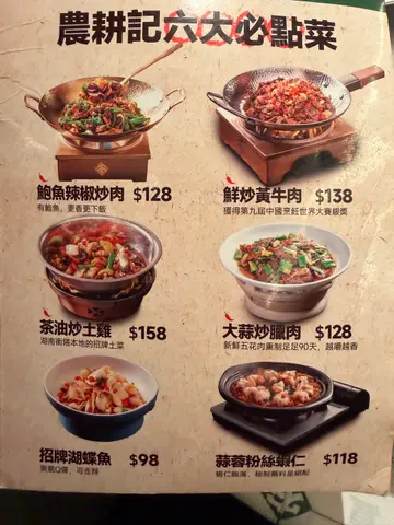 鲜炒黄牛肉(可减辣):新鲜黄牛肉用芹菜、蒜头等一起炒,新鲜热辣上桌。粉丝蒜蓉虾(可减辣):店员即场在客人的餐桌上即时把虾蒸熟。拌菜有粉丝、洋葱、韭菜等,虾肉新鲜弹牙,粉丝洋葱等入味又美味。茶油炒土鸡(可减辣):鸡肉拌上木耳、沙葛和辣椒,加上茶油炒熟,闻到浓浓的茶油香味,入口感觉鸡肉鲜嫩可口。鲍鱼辣椒炒肉:白木耳、鲍鱼仔和猪肉拌著青辣椒炒,主角是青辣椒,不能吃辣的我们也能吃,真的不太辣。高压锅红薯饭:二人就给了一锅饭上桌,内有红枣和番薯,米饭香软可口好吃。香水柠檬茶:很大的一杯,采用了中国香水柠檬酸,入口酸甜开胃、清油腻👍整体而言,这家餐厅的菜肴都做得正宗、有特色,味道很不错,想要品尝湘菜口味的,可以去农耕记试试。不能吃辣的,可以和店员沟通,有些菜肴是可以免辣或减辣的…查看更多