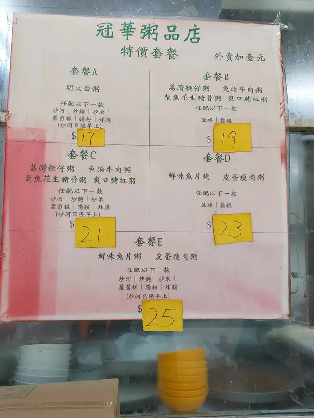 早前剛食完新耀榮粥店,就有網友推介附近的這間給我,還說這裏的粥更好,而且價錢平;今日見時間有空,就過去試吓。🤔店內地方比較細,牆上掛上大大小小不同的膠袋,看似比較混亂;同樣叫了皮蛋肉片粥、炸兩及炒麵。炒米及炒麵放在鐵兜內,完全沒有加熱,凍冰冰的夾起就上枱,吸引度不高;炸兩明顯放了一段時間,又係凍冰冰上枱,中間的油條軟腍腍,有可能係隔夜貨色,放在熱粥內浸泡一會,才稍為比較好一點。😓粥底明顯加入大量粟粉,雖然杰身但口感粉粉的,不是我杯茶;肉片明顯唔新鮮及煮得過熟,皮蛋份量更是少得可憐;雖然價錢比新耀榮平啲,但水準明顯相差很遠。🥲最離譜係胡椒粉,不知放了多久,濕淋淋的黐在一起,完全倒唔出,看見都唔開胃;水準這樣差,竟然還會有人推介!😅#皮蛋肉片粥 #炸兩 #炒麵#冠華粥品店地址: 香港長沙灣青山道255號地下8-9號舖…查看更多