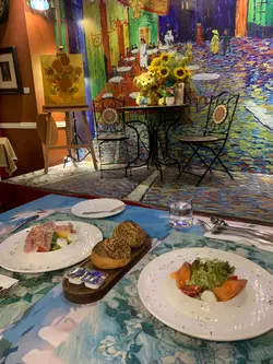 走入凡高厨房,第一眼就会觉得自己行咗入一间小巧的画廊😍 四周墙身都渗满梵高嘅色彩元素——星空的笔触、向日葵的暖黄——连砖瓦都似乎拥有自己嘅故事❤️ 餐厅内仲有个超大嘅「打卡位」,好似原寸放大嘅画布咁,影相一流,保证可以洗爆社交平台🤭 角落仲摆咗张桌球枱,食完饭仲可以轻松玩一局,就好似嚟咗朋友屋企咁自在😚 餐牌方面,最值得一提嘅,系佢哋嘅「梵高画布蛋糕餐」✅ 上台嘅系一件雪白似画布嘅蛋糕,旁边配埋几款食用颜料,同画笔一样嘅小工具🌟 食客可以亲手挥洒即兴灵感,画一朵向日葵,或者简单几笔星空,分分钟画功唔重要,重点系享受过程😆 ——呢个环节真系劲有趣,食之前已经多咗一份艺术参与感😘 至于主菜推荐,海鲜烩饭饭粒吸满海鲜精华,口感绵滑得嚟又唔会太「淋」,每一啖都有虾同青口嘅鲜甜味👍 墨汁海鲜意粉都唔错🥰 黑漆漆嘅意粉一咬落去居然好清爽,大虾、带子相当抢镜,系一个带少少神秘气息嘅菜式☺️ 有兴趣可以叫返件朱古力心太软😘 唔使多介绍,一切开就有香喷喷嘅朱古力味四溢,配埋雪糕食,完美收尾🤤 饮品方面,点名要试鸡尾酒❣️ The Starry Night🥳 用蓝橙酒打底,撞上柠檬嘅清新,再加梳打水嘅气泡感,入口微甜清爽,颜色迷人,望住杯入面嘅湛蓝,就好似将夜空握喺手中😎 …Read More