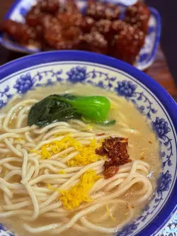 。葱油拌面,葱油用新鲜葱段慢火炸,再落少少猪油增添风味。捞匀后,每一条面条都挂满油香。面条弹牙有嚼劲,葱油香气十足,食落唔会腻