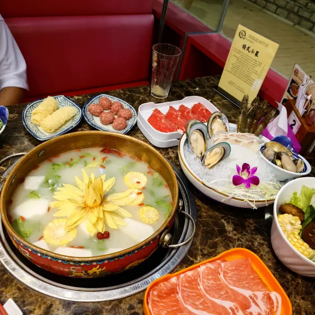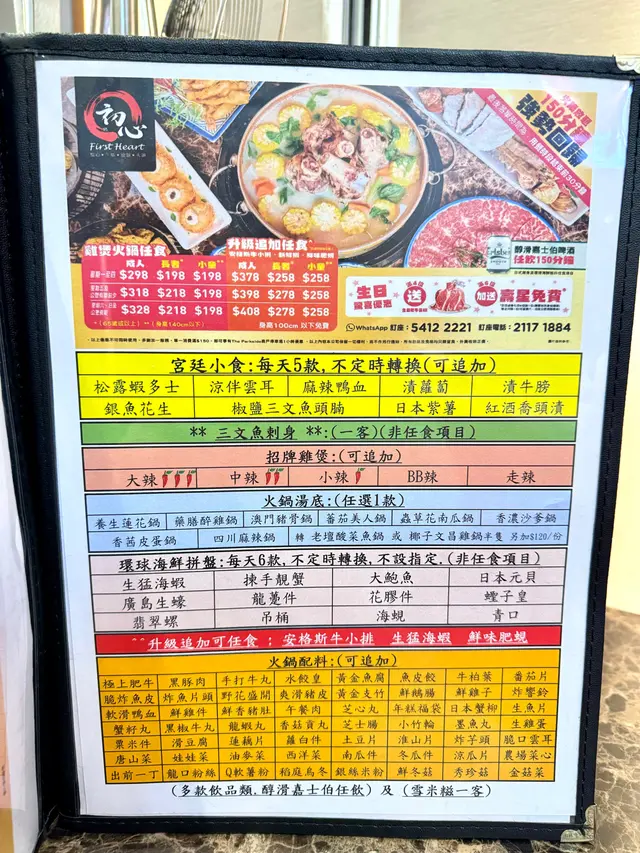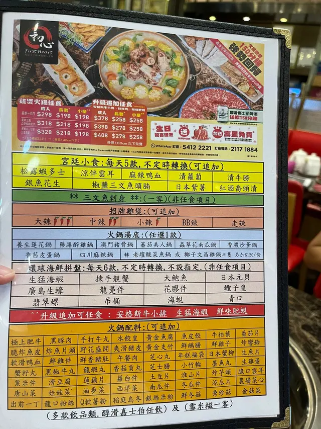 入秋啦🍂又系时候打边炉。之前经过都有留意到呢一间舖, 原来佢哋除咗做点心小菜,仲有个超抵食嘅鸡煲火锅放题。平日星期一至四只须$298 /位,价钱包左宫廷小食,三文鱼刺身,鸡煲,海鲜拼盘,火锅,多款饮品种类任饮,加士伯醇滑啤酒都系任饮家。仲要食足150分钟。入到嚟第一嘅感觉系每位店员都好客之道,好热心详尽讲解店舖有啲乜嘢食,每款项目包啲咩,难得一见。(1)宫廷小食 (可追加)松露虾多士麻辣鸭血凉拌云耳椒盐三文鱼头腩盐香炸鸡翼(2)三文鱼刺身虽然唔可以追加,但每一块都是厚切肥美。(3)鸡煲 (可追加)鸡件滑溜,比出边鸡煲不会太死咸浓味(4)火锅汤底都有10款选择,酸菜鱼或椰子文昌鸡锅需要额外加钱,最后我哋就拣咗个养生莲花锅,贪佢清清地咁先食得出配料嘅新鲜。另外就系要睇住𠮶朵莲花放落去嘅仪式感🤭(5)环球海鲜拼盘每天会有六款(非追加)当日拼盘有海虾,广岛蚝,翡翠螺,龙趸件,蛏子皇,花甲。 全部都好新鲜鲜甜。好比一些大集团。配料我会推介以下几款👍👍手打牛丸:弹牙重牛味极上肥牛:看起来很瘦,但一点都唔嚡口,重牛香味。鲜鹅肠: 一上菜就见到肥膏满满非常新鲜,绝不是雪藏品质。鲜鸡子:粉红嫩滑。日本蟹柳:超大条,口感满满。水饺:大大粒,满满的馅料。饱满的一餐,店员再送上两粒雪糕糯米糍,作为完美的句号😍