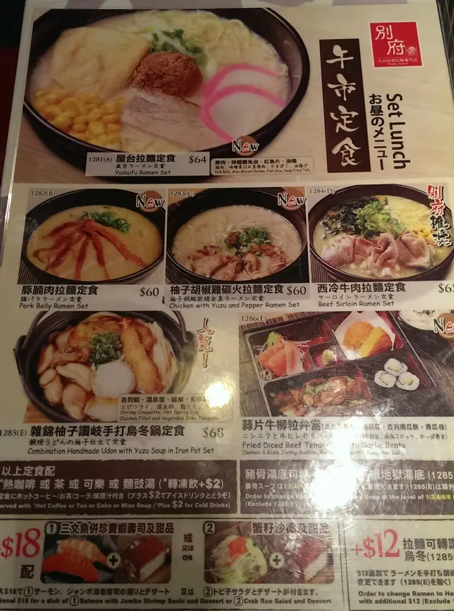 地點: 屯門別府餐牌上都有好多日本款式睇來睇去 , 都係叫 lunch set 抵 d ,仲可以加 $18 配壽司 , 甜品和飲品 .豬扒烏冬 ~ 賣相 ok , 味道都唔錯 , 但配料就唔多喇 ,豬扒好冧 , 入口都好香口 , 但烏冬可能過左時間 ,出現黏稠感 , 湯底就冇加味精 , 因為食完都冇口渴 .海鮮麵 ~ 賣相一樣都 ok , 但冇咩海鮮料 , 勝在配料多 ,同豬扒烏冬湯底唔同 , 呢個係海鮮 , 飲落比較鮮甜 ,而麵入口岩岩好 , 唔太軟同硬 .有 2 件壽司 , 甜品和飲品 , 不過不失 , 但唔記得影甜品 .仲 order 左個溫泉蛋 , 味道都 ok , 不過好似熟左小小 .Overall , 個餐就比較細份左 , 加 $18 就有埋壽司 , 甜品和飲品 ,咁食完都係岩岩好 , 但價錢都要大約$80-90 到 , 中價位 ,食物唔太特出 , 但服務態度好好 , 環境就一般 , 評語 : 不過不失 .查看更多