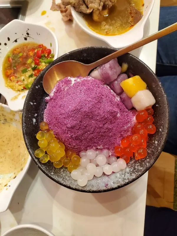 最近去咗荃灣「別忘了」打邊爐,同其他連鎖台式火鍋放題專門店不一樣,依度有好多不同台式火鍋湯底、台式甜品、台式手搖飲品可以無限暢享,今次食完晚飯,仲額外單買咗兩杯台式手搖飲品翻屋企繼續飲。臨走前,仲喺櫻花樹下或許願區下掛上願望卡,祈求願望實現。*此餐廳收取加一服務費。120分鐘仼呻成人Set B 7品(兩人$636),鴛鴦鍋,台式精選酒香麻油雞湯底,麻油香味令湯底飲落好香口,酒香味道清淡,內有雞肉、紅棗、杞子,略嫌湯底比較油膩;惹味香甜台式壽喜燒湯底,內有冬菇、洋蔥,味道甜鹹。澳洲M7牛胸腹(跟餐$0),油脂分布均勻,食落油脂味濃。澳洲M7大米龍(跟餐$0),肉味濃厚。日本鹿兒島茶美豚梅肉(跟餐$0),雖然脂肪比例較少,但肉質嫩滑、不韌。澳洲250日穀飼卡樂Beef (跟餐$0)。精選牛板腱(跟餐$0),食落帶有筋位。西班牙粟飼豬梅片(跟餐$0)。森永牛奶布甸(跟餐$0),奶味醇厚。台式甜品(跟餐$0),包括有乳酪口味仙草雪花冰、檸檬愛玉凍、杏仁果凍、飄雪世界、香草口味雪糕配窩夫、自家製三色QQ粉粿。47款台式飲品(跟餐$0),鮮芋奶綠、別忘了水果茶、香橙白桃烏龍、小芋圓奶綠、爆打雷萌四季春、梅子綠茶、雷萌胭脂桃花紅茶、仙草奶綠、柑桔檸檬沙冰。爆Chill芝青青(單點$42),表面鋪滿奶蓋,味道鹹香,內有青提子肉,味道清甜。小芋波波奶茶(單點$42),內有小芋圓、珍珠、仙草,茶味濃香。…查看更多