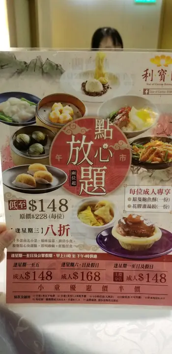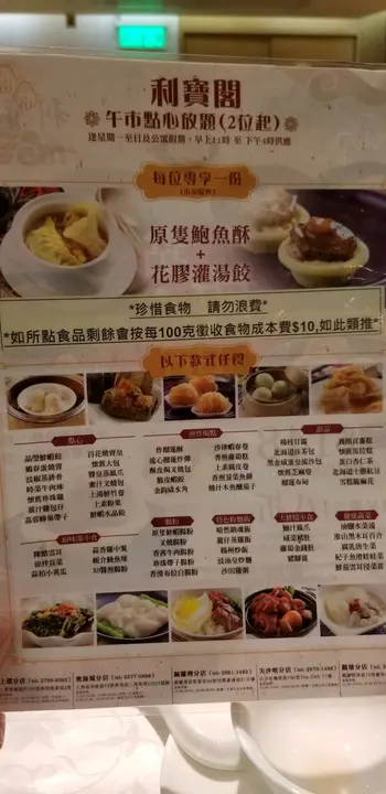 /利宝阁🇭🇰/#sa上环篇 #sa午餐篇 ➖➖➖计过都几耐无去过茶楼饮茶屋企人最钟意食点心🧆所以上星期就同左佢地去饮茶知道有个点心放题几抵食🙈(如果食得多野) 任食两个钟平时日式、韩式放题就见得多点心系少见啲 除咗上环之外尖沙咀观塘大角咀铜锣湾都有分店▪️▪️▪️点心放题 $148/人 仲会送每人一碟鲍鱼酥同灌汤饺😋有唔同种类嘅点心、煎炸焗点、甜品、肠粉、粉面饭、大排档小食同蔬菜 连黯然销魂饭都有都试左几多唔同嘅食物 介绍唔晒 所以就拣啲黎介绍🙈▪️▪️▪️1️⃣鲍鱼酥+ 灌汤饺鲍鱼酥嘅皮酥脆 唔会好油 但都有少少易碎🙉灌汤饺 皮薄爆馅如果肉馅可以更厚实就好➖➖➖分数: 7.5/10➖➖➖2️⃣点心有平时大家都会见到嘅虾饺、烧卖、牛肉球等最钟意就系钟意食虾饺 虾肉结实 皮厚薄均匀 较为特别嘅荔蓉蜂巢带子虽然带子口感唔算好突出但钟意食佢嘅芋泥 仲有面头松化嘅「蜂巢」 ➖➖➖分数:7.8/10 ➖➖➖3️⃣煎炸焗点我地叫左沙律虾春卷、腐皮卷、木鱼酿茄子觉得呢几款相对较油腻 沙律春卷几惹味但虾肉部分无虾饺咁扎实 茄子鱼肉较硬➖➖➖分数: 6.5/10 ➖➖➖4️⃣肠粉正常质素 肠粉皮软滑但原来一条嘅意思系1/3🙉但可以每样食啲 就可以试晒所有口味!个人觉得牛肉肠最好味 带子口感可以更突出➖➖➖分数:7/10➖➖➖5️⃣大排档小食食左猪脚姜同金钱肚 猪脚姜几入味 但蛋就较为硬实金钱肚口感唔错 萝卜鲜甜➖➖➖分数:7.2/10 ➖➖➖6️⃣甜品要左流沙包、抹茶包、雪糕脆麻花等流沙包系几香蛋黄酱味 但图文不符系expect 佢黑金色抹茶包又唔知点解变咗红豆包芝麻卷味道可以更突出 略嫌有啲淡最有惊喜系雪糕脆麻花面头似蛋散 初初以为雪糕系雀巢但食落朱古力味颇浓 有果仁碎➖➖➖分数:7.9/10 (系包𠮶度扣分) ➖➖➖📍利宝阁上环德辅道中199号无限极广场2楼|大角咀海庭道18号奥海城二期商场UG01号舖|尖沙咀弥敦道100号The ONE 17楼|观塘开源道79号鳄鱼恤中心9楼…查看更多